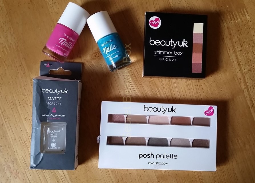 I was asked to pick a few products from Beauty UK to review and these are the products that I chose. They arrived very quickly at my house in a wonderful shiny pink jiffy bag which made me even more excited about the products I had chosen. I picked a hot pink and blue nail varnish as I thought the colours could go quite well with each other, the other nail varnish I went for was a matte top coat as I have never tried a matte polish before. I then couldn’t resist the Posh Palette, which is a palette with 10 eye shadows in, and I also chose the Shimmer Box n Bronze which is absolutely gorgeous!
